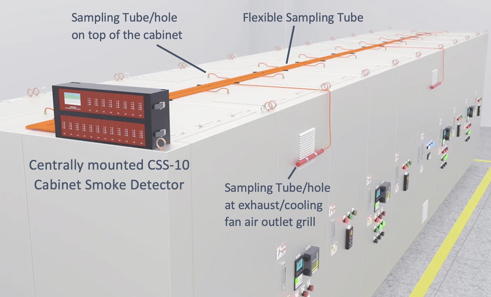 The CSS-10 units can be installed on one side of the switchboard, with each CSS sampling tube extending to the protected cabinet. The air sampling holes are positioned where smoke is most likely to occur in the event of a fire, such as: